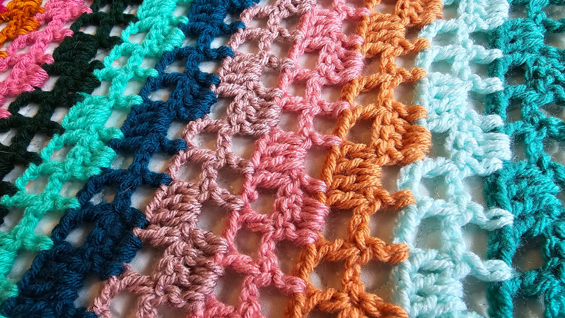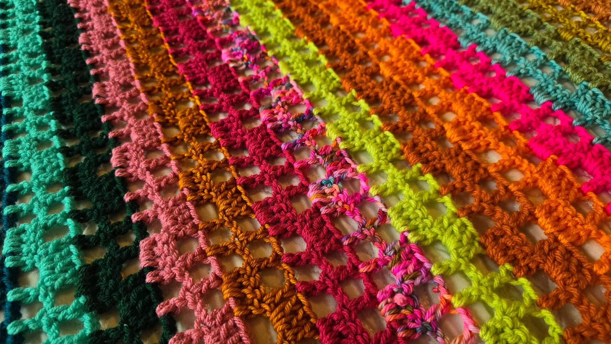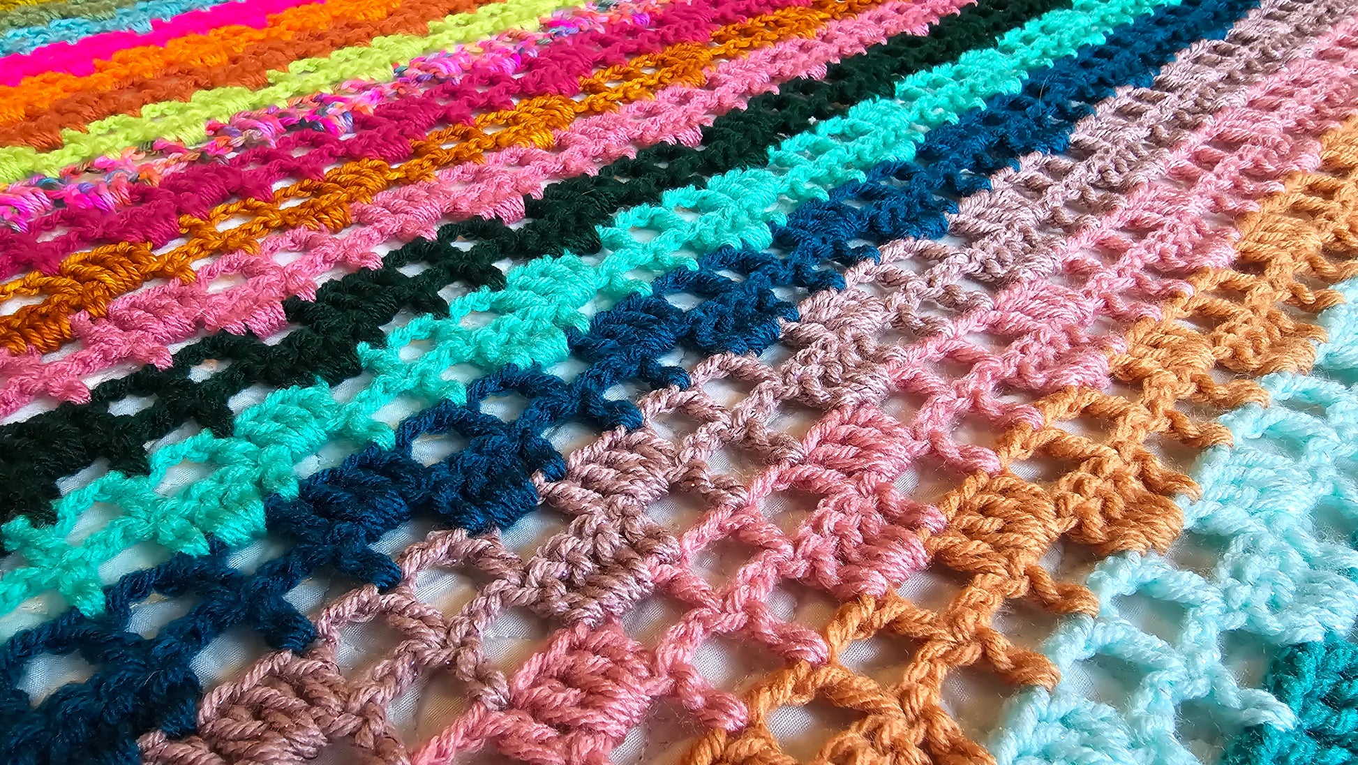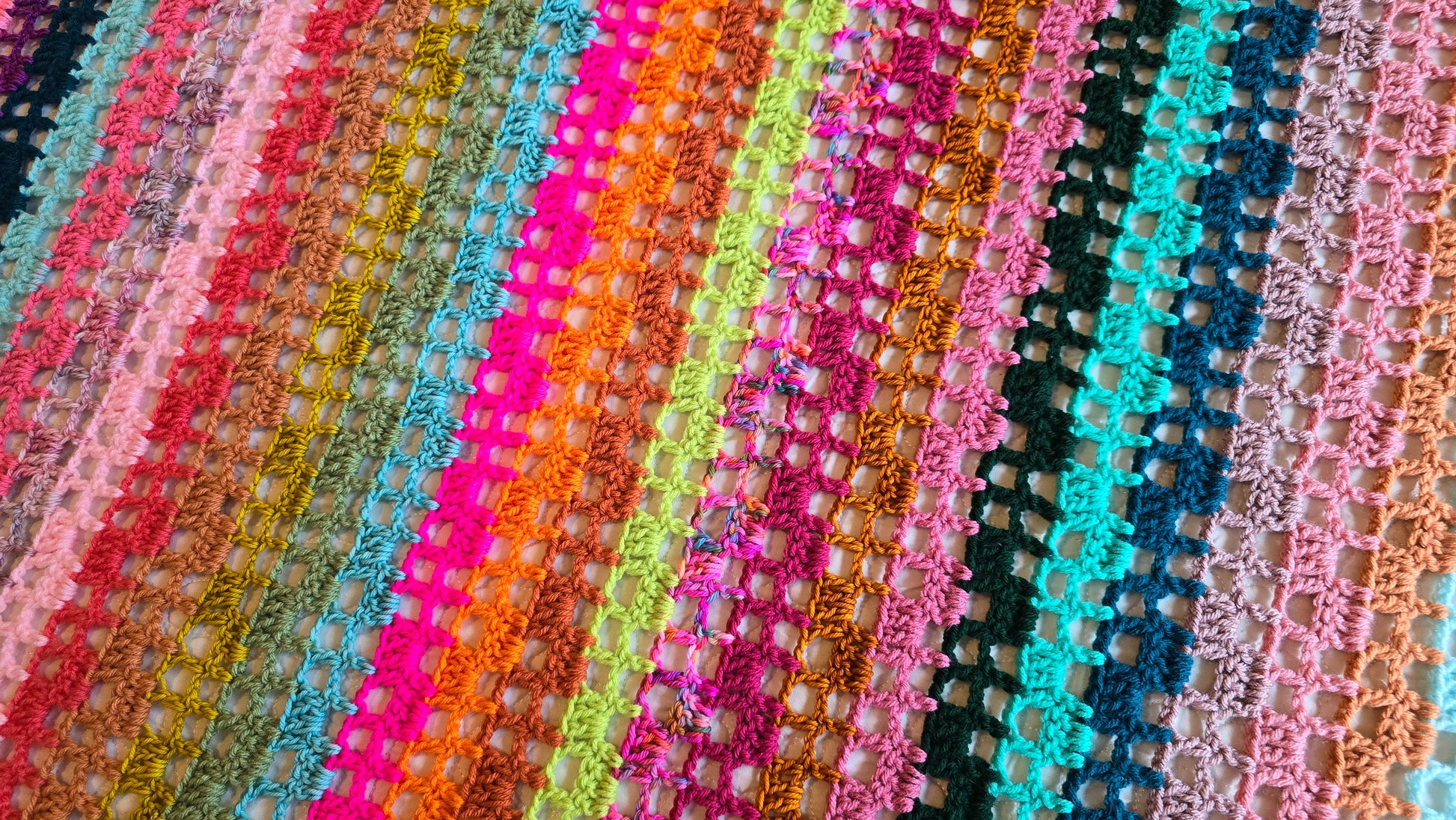 This is my Luxe Twinkle Afghan! A vibrant pop of color, gorgeous filet lace blanket! A handmade crochet blanket is a beautiful way to add texture and warmth to any room. My blankets are all made with gorgeous, colorful yarn that is soft and squishy. It will be a real statement piece in your home.