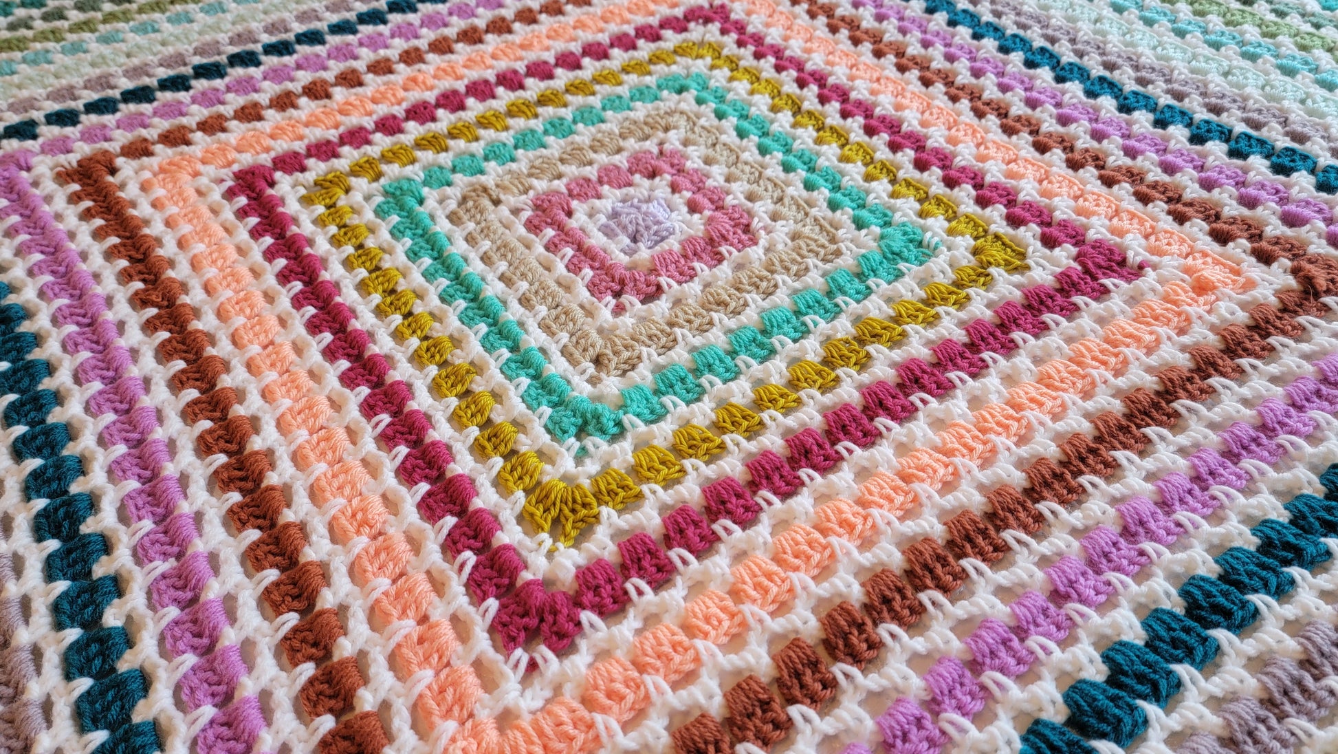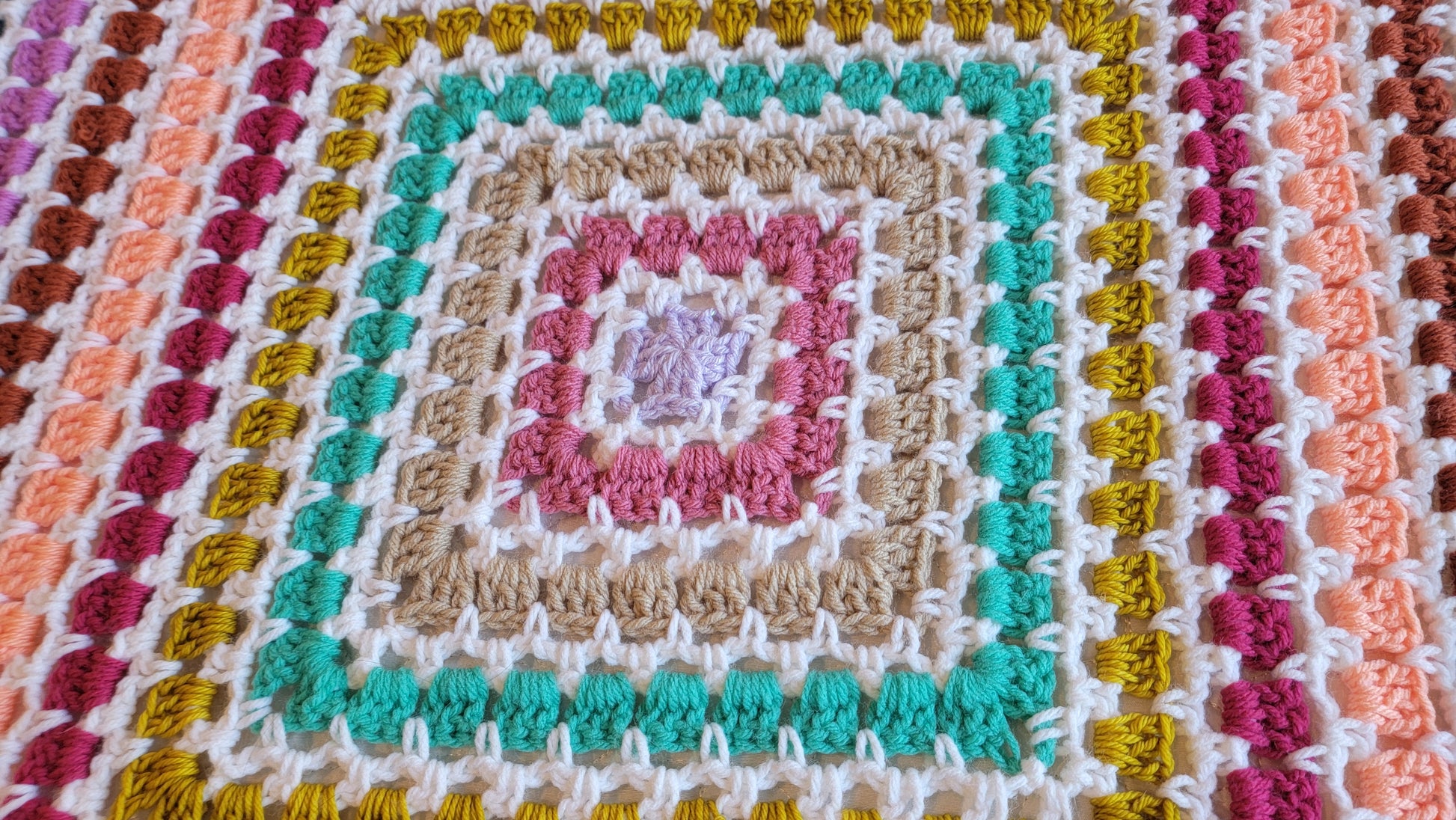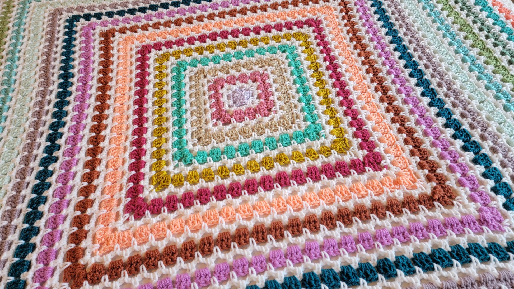 This is my Tea Time Afghan! A vibrant pop of color, gorgeous square blanket! A handmade crochet blanket is a beautiful way to add texture and warmth to any room. My blankets are all made with gorgeous, colorful yarn that is soft and squishy. It will be a real statement piece in your home.